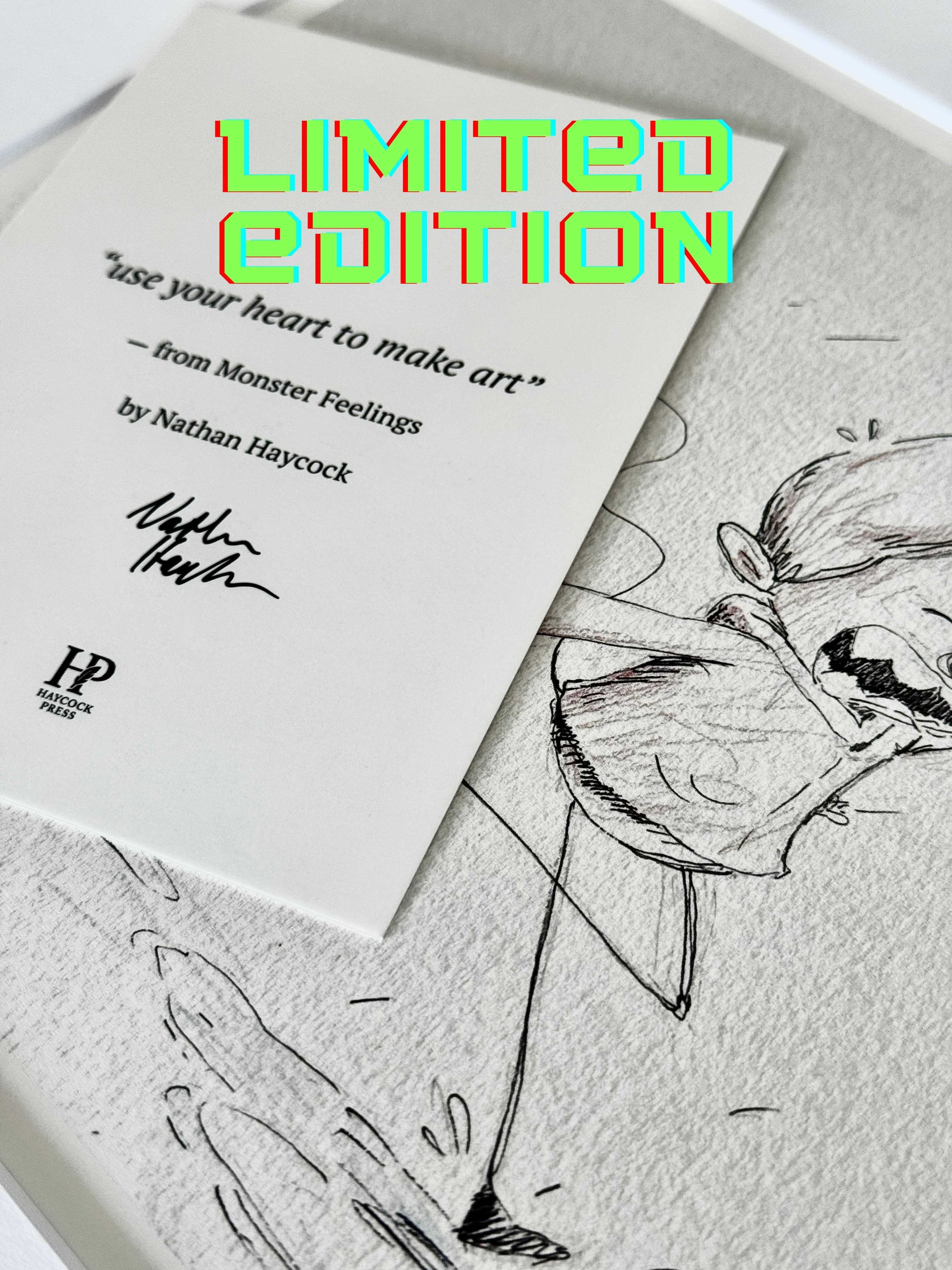 A behind-the-scenes ink sketch from the Monster Feelings world. Printed on smooth heavyweight matte stock and supplied with a signed Certificate of Authenticity.